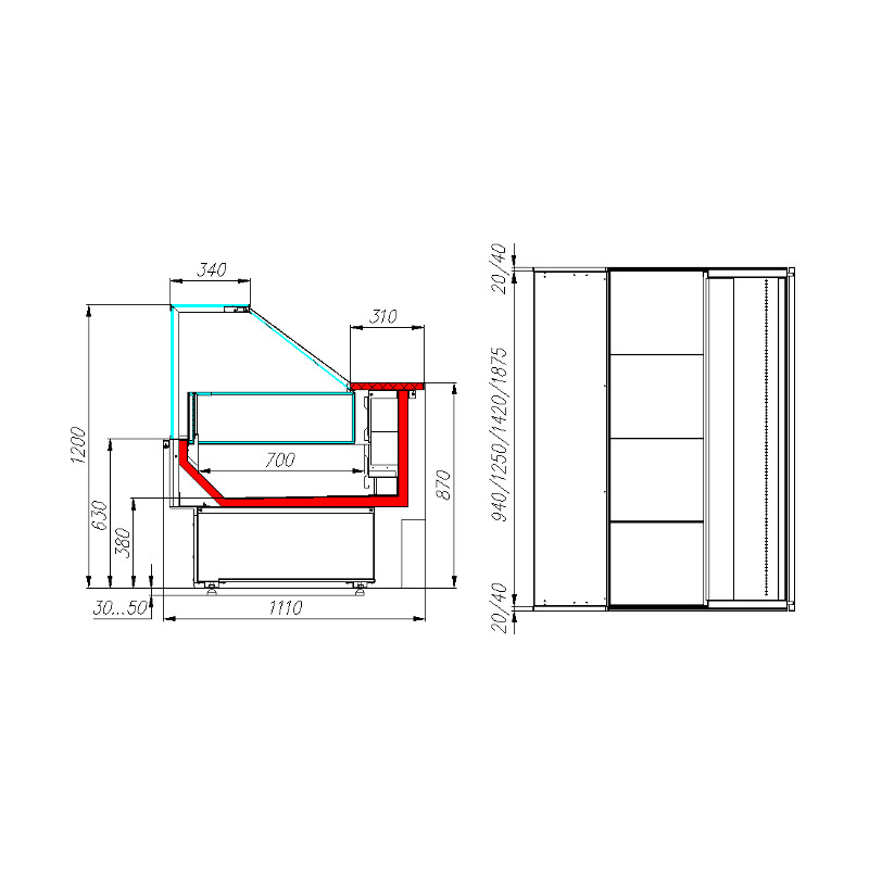 - 2х ступенчатые поддоны для выкладки. Общая высота поддона -120 мм, общая глубина-480мм