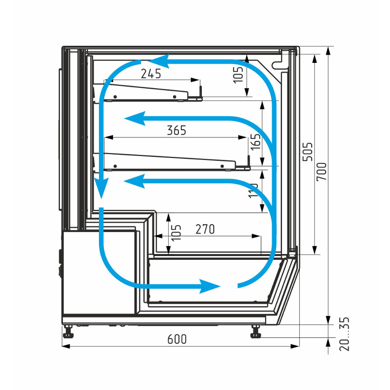 Глубина выкладки: 270 мм (2 полки 245, 365 мм)