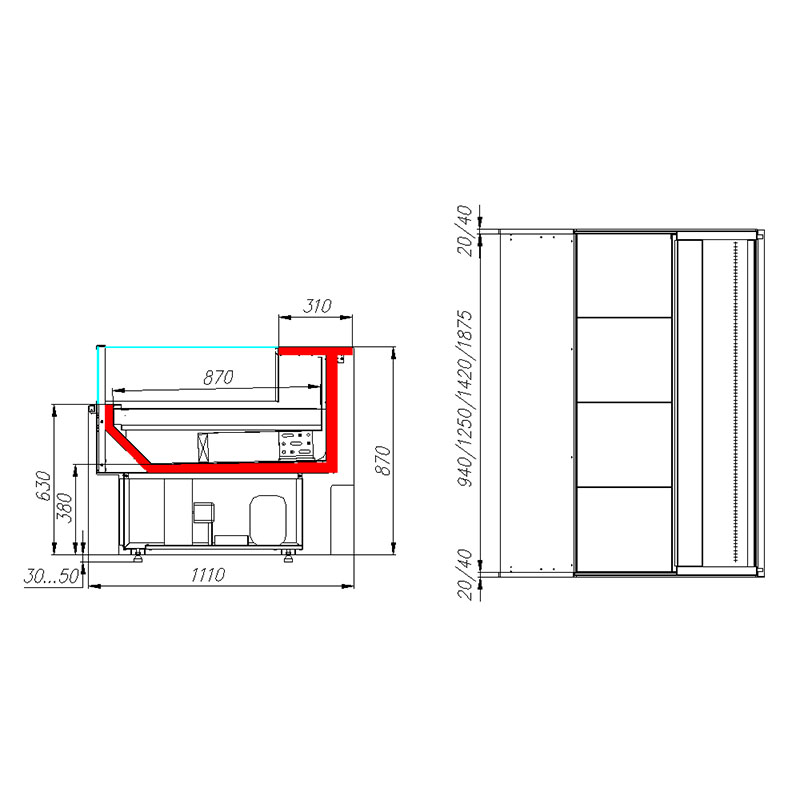 - 2х ступенчатые поддоны для выкладки. Общая высота поддона -120 мм, общая глубина-480мм