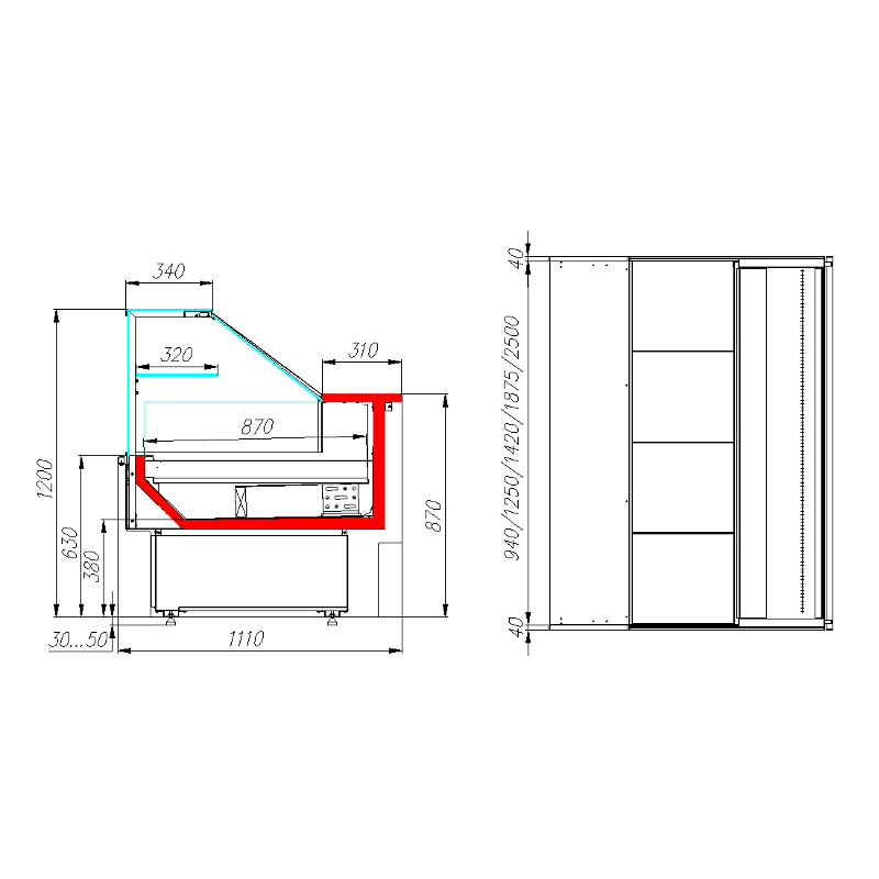 - 2х ступенчатые поддоны для выкладки. Общая высота поддона -120 мм, общая глубина-480мм